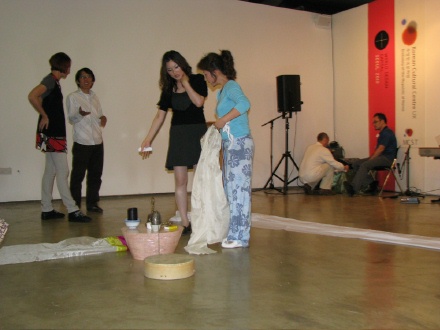 Philip admitted that his wife Louise first knew of Korea when she saw the dance troupe the Little Angels on Blue Peter. And now a former member of the Little Angels, Sunnee Park, was to perform a shaman ritual dance. She waved incense into the corners of the room, shook a very loud bell at each wall to ward off evil spirits, span around with swathes of cloth in a pretty way, all the while trying to show the trance-like state of the shaman. It was a stylised dance inspired by shamanistic ritual, which for me didn’t convey the slightly scary, ecstatic emotion of the real thing. But as a dance based on an aspect of Korean culture, it works well.