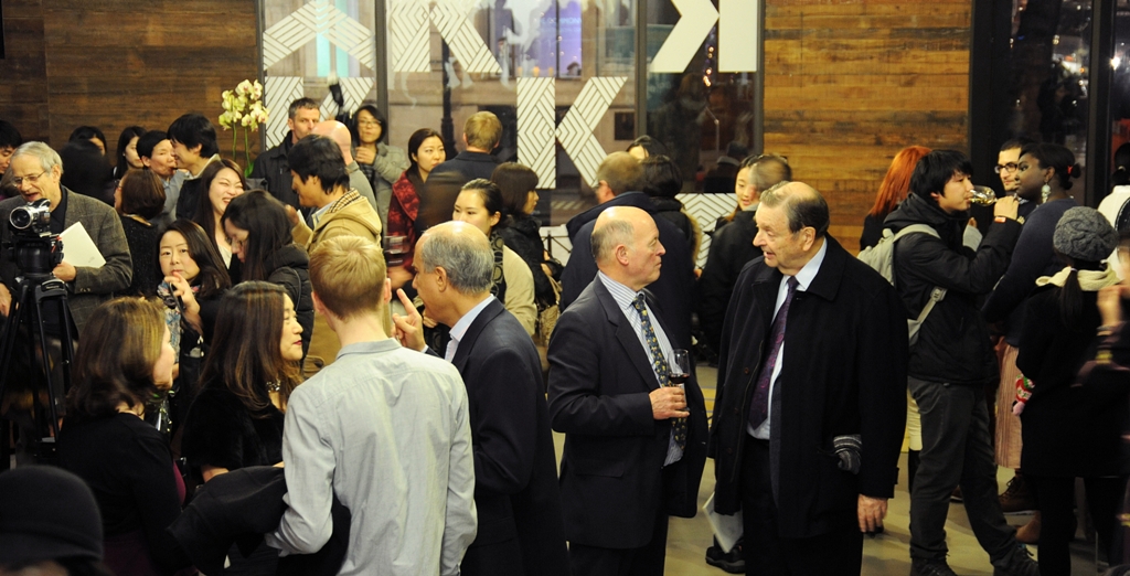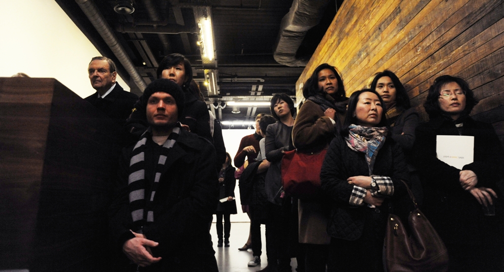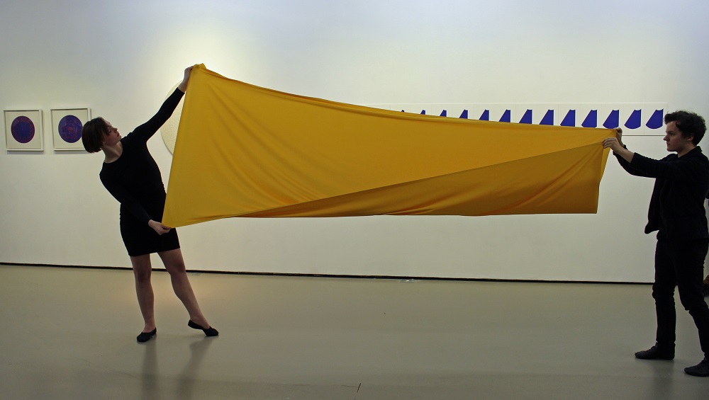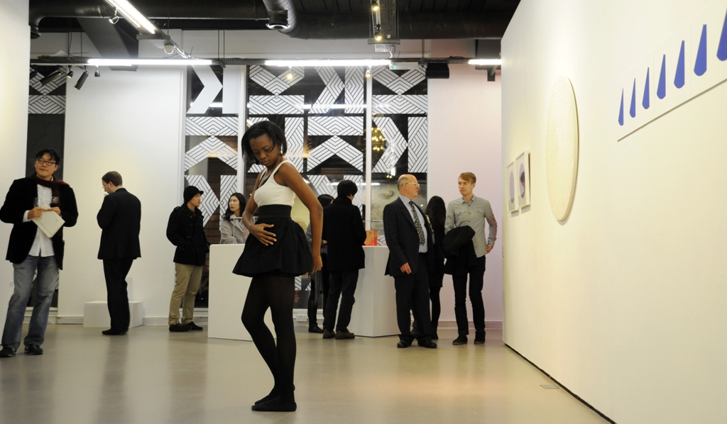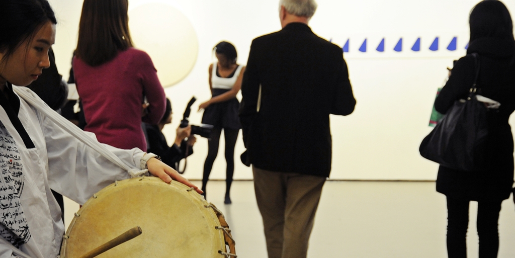 Dancers from the University of Roehampton opened the event. Behind them (L to R: Soon Yul Kang: Unity (2012) Harmony (2012) Spiritual Journey (2012 – mainly hidden); Bada Song Ta-il 16 (2012 – partially hidden)