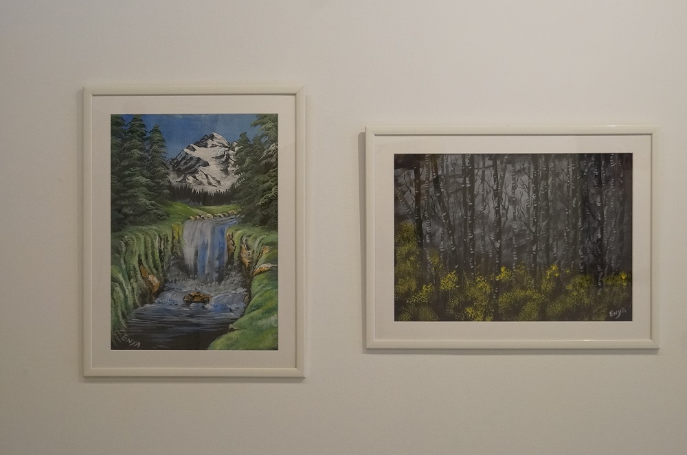 Enya Elswood: Glacier Waterfall (2011). Watercolour on paper, 72 x 55 cm. Birch trees (2011). Watercolour on paper, 72 x 55cm