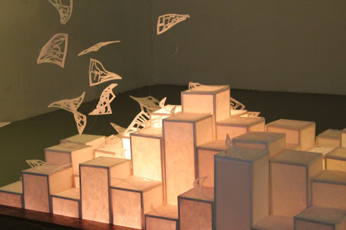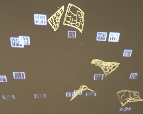 Possibly the work which attracted the attention of the passers-by in Northumberland Avenue was the installation by Sooyung Lee and Hyunseok Lee entitled 108 Agonies. The centrepiece was a construction which could have been a stylised city – a 6 x 18 grid of towers made of yellowish-white hanji and wood lit from below – symbolising the 108 agonies with which man is afflicted. From the top of each tower a square character was resting, or from some towers the character was lifting off and floating heavenward, perhaps symbolising the prayers we intone when performing the 108 bows. An animation of these same prayers floating upwards was projected onto the back wall, and faint music in the background made this exhibit one to linger over.