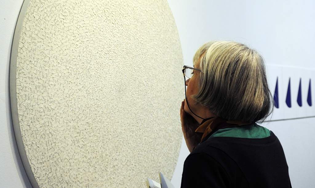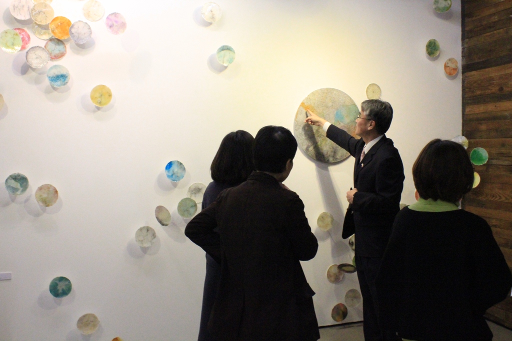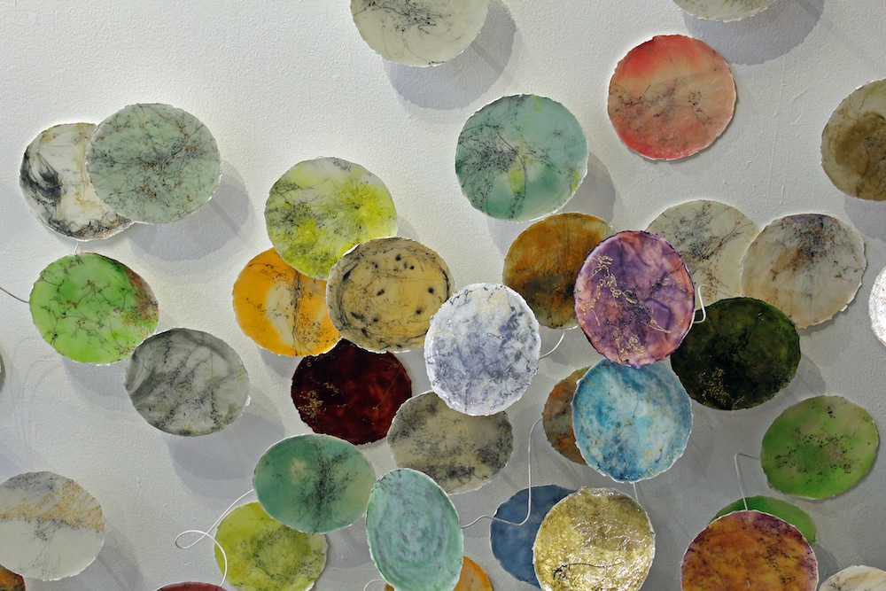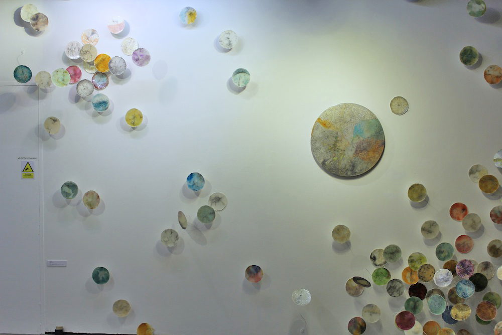 Joohee Chun: 복, 福, Bok, Blessing (2012). Acrylic on paper: 16cm diameter; Acrylic on aluminium panel: 60 cm diameter, 2.5cm floating, 318 x 650 cm (detail)