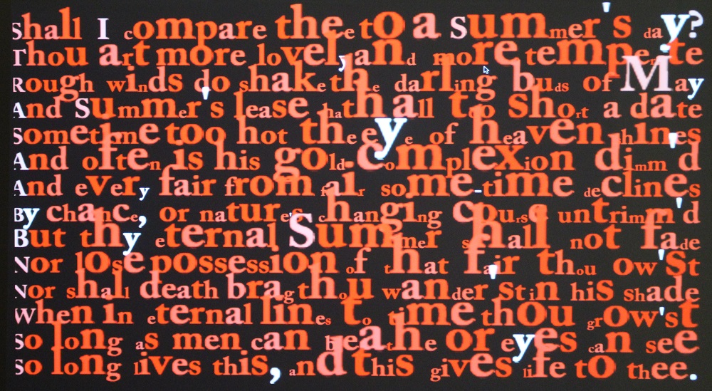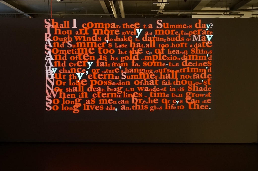 The work shows Shakespeare’s 18th and most famous sonnet, set in a passionate or anguished blood-red typeface against a sombre black background, whose colour perhaps symbolised the wisdom achieved through a painful parting – or maybe the depths of despair. Each letter Y in the text was coloured white – as the artist asks Why the parting had to happen. The words ebb and flow like waves in the sea, while individual letters shrink and grow in font size giving an uneasy feeling of disquiet. In the background, Ccotbyel’s haegeum playing provided a soothing soundtrack to contemplate the text.