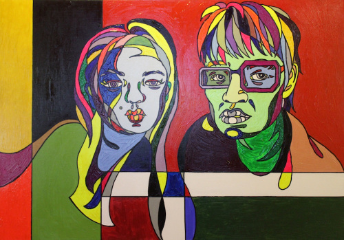 Unmi Li‘s bold acrylics were a re-interpretation of the five elements of Korean culture – wood, fire, earth, metal and water, each of which has one of the five O Bang Saek colours. Her work explores the relationship between the external and internal, the macrocosm and microcosm. The characters in Five Emotions showed feelings ranging from sadness via envy to desire, the range emphasised by the vibrant use of contrasting colours.