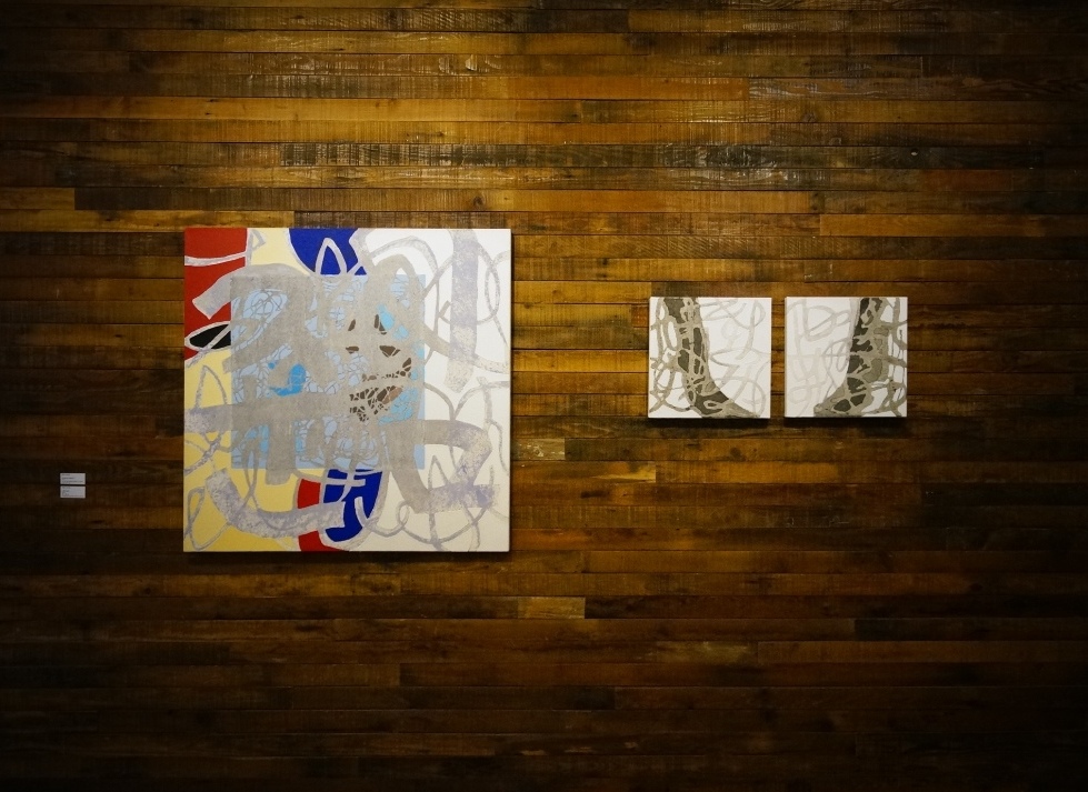 Kitty Jun-im‘s work greeted you as you entered the exhibition itself. Her painting is abstract but is inspired by calligraphy, and one of her works was virtually a self-portrait, with her name Jun Im inscribed boldly on the canvas. The background, in reds, blues, creamy yellows, white and black respected the O Bang Saek theme.